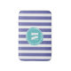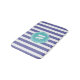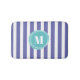 Joli et tendance tapis de bain rayé en bleu violet) et blanc rayé motif avec votre monogramme à l'intérieur d'un cercle bleu aqua abstrait. Facile à customiser en cliquant sur le bouton personnaliser.