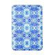 Tapis de bain à effet batik, motif carrelé, avec éléments floraux abstraits, dans les tons denim, cobalt et bleu ciel contre un arrière - plan blanc