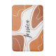 Tapis de bain orange personnalisé avec un motif géométrique abstrait moderne et un imprimé de nom personnalisé au centre. rideau de douche assorti disponible.