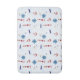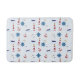 Un tapis de bain bleu-clair avec un motif orienté de belle marina. Phare rouge et blanc, voilier bleu, ancre rouge, volant bleu de bateau et mouettes.