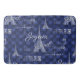 La Tour Eiffel, les mots "Joyeux Noël", Paris en typographie vintage, et les étiquettes vintages pour le champagne et le cacao en blanc sur un arrière - plan bleu profond aux flocons de neige bleu clair confèrent à la salle de bain un tapis de natte à thème français intéressant. Les articles correspondants sont disponibles dans mon magasin Zazzle.