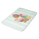 Un tapis de bain illustré d'un bol de crème glacée avec 3 succulentes boules couvertes de bonbons saupoudrés. Un cône glacé également avec 3 boulettes de chocolat, vanille et fraise. Un bol de desserts rempli de crème glacée au goût néopolite avec une délicieuse cerise sur le dessus. Un motif à rayures vertes et blanches dans l'arrière - plan.