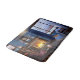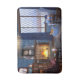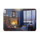 Un coin lecture cosy par une journée enneigée d'hiver, avec un chat roux assis regardant le feu ardent. Autour du foyer, des fauteuils moelleux, des bougies allumées et des piles de livres et une tasse fumante pour parfaire le confort. À l'extérieur, un saule recouvert de givre et une haie de hêtres sont masqués par la neige qui tombe.