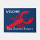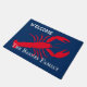 Tapis de porte d'accueil personnalisé avec motif homard rouge. Faites votre propre monogrammed intérieur / extérieur mat personnalisé avec la couleur et le texte arrière - plan personnalisé. Ajoutez votre propre message de bienvenue, nom de famille, nom de famille, lettre initiale ou citation amusante. Idée cadeau mignonne pour la nouvelle maison / chauffage domestique, salle de mariage, magasin, magasin de poisson, bureau d'entreprise, affaires etc. modèle de typographie vintage. Créez votre propre tapis / tapis d'entrée unique pour porte d'entrée / entrée ou hall. Décor / décorations sur mesure pour maison nautique. Idée cadeau maritime mignonne pour les amateurs de voile / navigation de plaisance, couple, marin, capitaine de bateau ou de nouveaux mariés. Couleurs bleu marine et rouge.