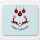 Une mousepad qui dit "Joyeux Noël" en texte courbe. Conçu avec une illustration de 2 cerfs de Noël sautant. Les cerfs sont faits de sériole rouge et noire, avec un peu de coeur entre eux. Les décorations de Noël en plaid rouge et noir sont accrochées au sommet.