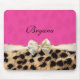 Tapis de souris à nœud à impression de léopard et guépard rose. Personnalisez avec du texte ou laissez vide.