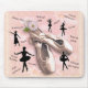 Paires de chaussures de ballet sur un arrière - plan rose, entourées par des danseurs et les mots français des mouvements de ballet.