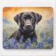 Un Labrador Retriever noir se trouve dans un champ de bleus vibrants, sa fourrure foncée contraste magnifiquement avec les fleurs bleues. Les yeux du chien sont concentrés sur le spectateur, ce qui traduit un sentiment de calme et d'attention. L'arrière - plan est doté d'un ciel doux et brumeux aux teintes chaudes orange et jaune, ce qui suggère un coucher de soleil paisible. Un cadeau idéal pour les amoureux du labrador.