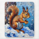 An adorable brown squirrel sheltering by a tree in during a snowy winter.