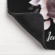 Un tapis de souris avec une aquarelle représentant un chat noir et un bouquet floral violet clair et rose. Devant une grande lune. Design et magique.