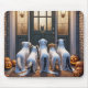 Cinq chiens déguisés en fantômes se tiennent devant un porche orné de lumières de lances jack-o-lanternes tandis qu'un chat curieux passe par la porte en verre