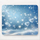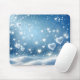 Des coeurs flottants dansent au milieu d'un paysage serein et enneigé illuminé par une douce lueur éthérée