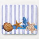 Aquarelle originale peinte par Sandra Gale, avec des étoiles de mer, des chevaux, des tortues et des coquilles sur un arrière - plan de bandes bleues translucides verticales. Conception idéale pour l'été, les maisons de plage, les bungalows ou pour tous ceux qui aiment la plage, l'océan ou le poisson.