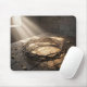 A crown of thorns rests on a rustic wooden table, with soft rays of light casting striking shadows and illuminating the fallen leaves around it