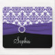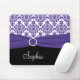 Ce sembler élégant mousepad pourpre, blanc, et noir de damassé a une broche assortie de ruban et de cristal de faux. Customisez-le avec votre propre nom, monogramme, ou tout autre texte.