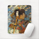 Tapis de souris de samouraïs de Kuniyoshi. Bois de graveur d'Ukiyo-e de la période d'Edo Japon. Utagawa Kuniyoshi a conçu certaines des peintures samouraïs les plus vibrantes et les plus impressionnantes de la période d'Edo. Sa description de Shimamura Danjo Takanori comporte les samouraïs dans la pleine armure utilisant son naginata tout en montant les vagues de la mer sur les dos de deux crabes bleus. Le samouraï a été frappé par les flèches multiples, mais continue à combattre violemment avec des vagues et des crabes se levant à l'arrière-plan. Un grand cadeau pour des fans d'Utagawa Kuniyoshi, peintures samouraïs, et art. japonais.