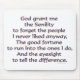 Dieu m'accordent la sénilité pour oublier les personnes que je jamais n'ai de toute façon aimées, la bonne chance à courir dans celle je, et la vue fais la différence. - Parodie de la prière de sérénité. Énonciation drôle et humoristique.