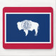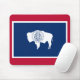 Ce design présente le drapeau de l'état du Wyoming, qui est un état doublement enclavé dans l'ouest des États-Unis. C'est le deuxième état le moins peuplé du pays. Le Wyoming est bordé au nord par le Montana, à l'est par le Dakota du Sud et le Nebraska, au sud par le Colorado, au sud-ouest par l'Utah et à l'ouest par l'Idaho et le Montana. Le surnom officiel du Wyoming est "Etat de l'Égalité", mais il est aussi parfois connu comme "Etat Cowboy" ou "Big Wyoming". La moitié ouest du Wyoming est principalement couverte par les chaînes des Rocheuses, tandis que la moitié est de l'état est une prairie à haute altitude appelée les Hautes Plaines. Le parc national de Yellowstone est partiellement dans le Wyoming et le parc national de Grand Teton est entièrement dans l'état. Cheyenne est la capitale de l'état et la ville la plus peuplée du Wyoming. Le drapeau de l'état du Wyoming comprend une silhouette de bison américain. Le rouge symbolise les Amérindiens et le sang des pionniers qui ont donné leur vie. Le blanc est un symbole de pureté et de droiture. Le bleu est la couleur du ciel et des montagnes lointaines.