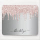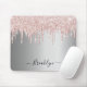 Un élégant tapis de souris girly et glam. Un arrière - plan faux argenté. Décoré de rose vif, de gouttes de parties scintillant scintillantes, de la peinture goutte à goutte. Un peu de luxe et de bling quotidien. Personnalisez et ajoutez votre nom. Le nom est écrit avec un script de style moderne écrit à la main. Lettres de couleur noire. Pour que les swashes ne suppriment que le nom de l'échantillon, laissez les espaces ou les émoticônes devant et après le nom