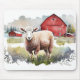 Mignonne mouton aquarelle dans un champ de ferme avec une grange rouge.