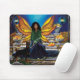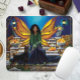 Une fée aux ailes orange et jaune sur des marches en pierre qui mènent peut-être au royaume des Fées. La Fée afro-américaine n'est pas seule, elle est avec son chien doberman gardien ce jour d'automne.