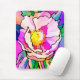 Mousepad, avec un design abstrait moderne de pivoine rose sur un arrière - plan coloré aux couleurs rose, bleu, violet et vert.
