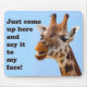 Amusante girafe mousepad avec une photo de closeup du visage d'une girafe. Le texte dit : "Viens ici et dis-le-moi en face !"