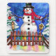 Couleur d'eau originale de Sandra Gale d'un heureux bonhomme de neige dans un jardin d'hiver couvert de neige. Un design idéal pour les jardiniers, les enfants, les mamans et tous ceux qui aiment les bonhommes de neige et les scènes de jardin de campagne.