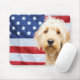 Goldendoodle s'assoit fièrement devant le drapeau américain lors du Memorial Day.