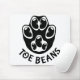 Une patte noire avec des haricots noirs comme orteils, avec le texte "Fèves d'orteil", sous la patte.