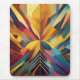 Au centre, convergent un ensemble dynamique de formes géométriques et audacieuses, formant une composition symétrique et colorée. La pièce utilise une variété de teintes, allant des jaunes chauds et des oranges aux bleus et violets cool.