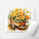 Cette mousepad unique présente une illustration de quelques fleurs dans un chariot en bois.