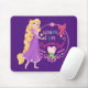 Rapunzel avec des fleurs décorant ses cheveux longs, debout à côté d'un cadre orné avec les mots "Glowant comme Rapunzel".