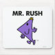 M. Rush est vraiment pressé d'aller quelque part. Ses jambes se bousculent et ses bras se balancent. Malheureusement, M. Rush se déplace toujours trop vite et ne remplit pas ses objectifs correctement, jusqu'à ce qu'il devienne enfin un livreur de courrier express. Ce personnage amusant de l'univers Roger Hargreaves créé Mr Men est un grand rappel pour prendre la vie un peu plus lentement ou nous pouvons manquer les détails importants.