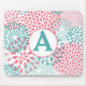 Tapis de souris rose, turquoise et gris. Un motif floral clair orne ce tapis de souris. Personnalisez avec votre initiale. Choisissez le style de police qui convient à votre style personnel.