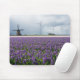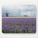 Mousepad avec un paysage avec un moulin à vent traditionnel et des moulins à vent modernes multiples pour produire de l'énergie verte derrière un champ avec la fleur pourpre de jacinthe dans la région d'ampoule en Hollande.