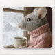 A gray mouse in a pink turtleneck holds a warm cup of coffee and gazes out the snowy farmhouse window, soaking in the serene winter landscape