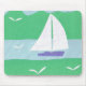 Cette mousepad est conçue avec un voilier blanc et des collines vertes.