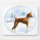 Noel. Evergreens, un arrière - plan enneigé, et les Basenji vous souhaitent une saison de vacances paisible pour Noël. Notre conception de chien fait un grand cadeau pour vous ou un ami.