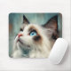 Un portrait en gros plan d'un chat Ragdoll aux yeux bleus saisissants. Le chat a un manteau blanc et moelleux et porte un collier noir avec un charme de pierres précieuses bleues. Les yeux du chat sont grands ouverts et concentrés sur quelque chose hors caméra, créant un sentiment de curiosité et d'émerveillement. L'arrière - plan est d'un bleu pastel doux avec de délicates fleurs roses disséminées dans l'ensemble, ajoutant une touche de fantaisie et d'élégance à l'image.