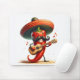 Un piment rouge anthropomorphe gai portant un gros sombrero et une moustache noire en montant une guitare