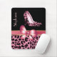 Tapis de souris élégant avec des graphiques d'un motif rose et noir de jaguar, sur la moitié inférieure du tapis de souris et d'un arrière - plan noir solide, sur le dessus. Un satin rose et goldtone regardant le ruban et l'arc, les courses à travers le milieu de la protection et les talons stylets d'impression rose à la mode de jaguar décorent le dessus. Le texte dans le rose est prêt à personnaliser pour vous-même ou comme grande idée de cadeau à votre Fashionesta préféré.
