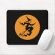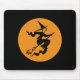 Un vol mauvais noir de sorcière devant une lune orange de Halloween sur son balai.