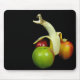 Tête de serpent sortant d'une banane reposant sur des pommes isolées sur le noir.