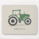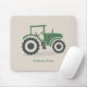 Un tapis de souris beige clair avec une illustration d'un tracteur agricole vert et gris en style dessin animé et texte personnalisable ci-dessous! Cela pourrait être un cadeau parfait pour un paysan ou un homme de la campagne !