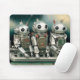 Trois charmants robots rétro-futuristes se tiennent côte à côte, avec des corps métalliques brillants, des yeux expressifs et des motifs fantaisistes. Leur apparence ludique est rehaussée par divers gadgets colorés.