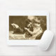 This lovely vintage photographiy shows a girl with her toy cat sitting in front of a typewriter.
