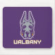 Le logo de la mascotte de l'Université d'Albany Great Dane présente une représentation stylisée de la tête d'un grand Danois. Le chien est illustré de lignes vives et audacieuses en violet et gris, lui donnant une expression féroce et confiante. Les oreilles sont hautes, symbolisant la vigilance et la force. Sous la tête du Grand Danois se trouve le mot "UAlbany" écrit en caractères d'or gras et bloquants, surligné de violet, renforçant l'image de marque de l'université. Cette conception représente les équipes sportives d'UAlbany, mettant en avant le pouvoir, la loyauté et la détermination.