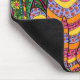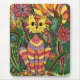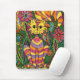 Ce chat rayé multicolore avec des marques colorées et très détaillées est assis à l'ombre d'un jardin dense et vif qui grouille de plantes et de fleurs exotiques, ornés de motifs ornementaux, dans ce design unique et édifiant.