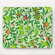Tapis de souris dans un William Morris Art Nouveau motif de citrons, grenades et pêches, avec des fleurs, sur des branches feuillues - fruit en vert citron et orange corail, avec feuilles verts, contre un arrière - plan à motifs, vert citron et blanc